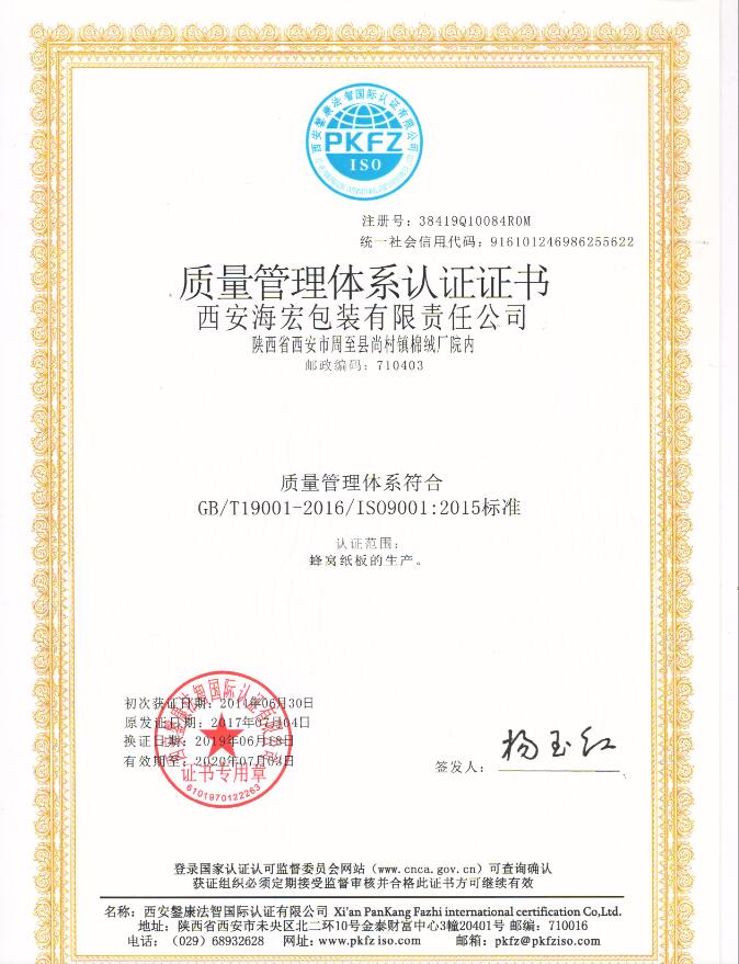 西安海宏包裝再次通過“ISO9001質量管理體系認證