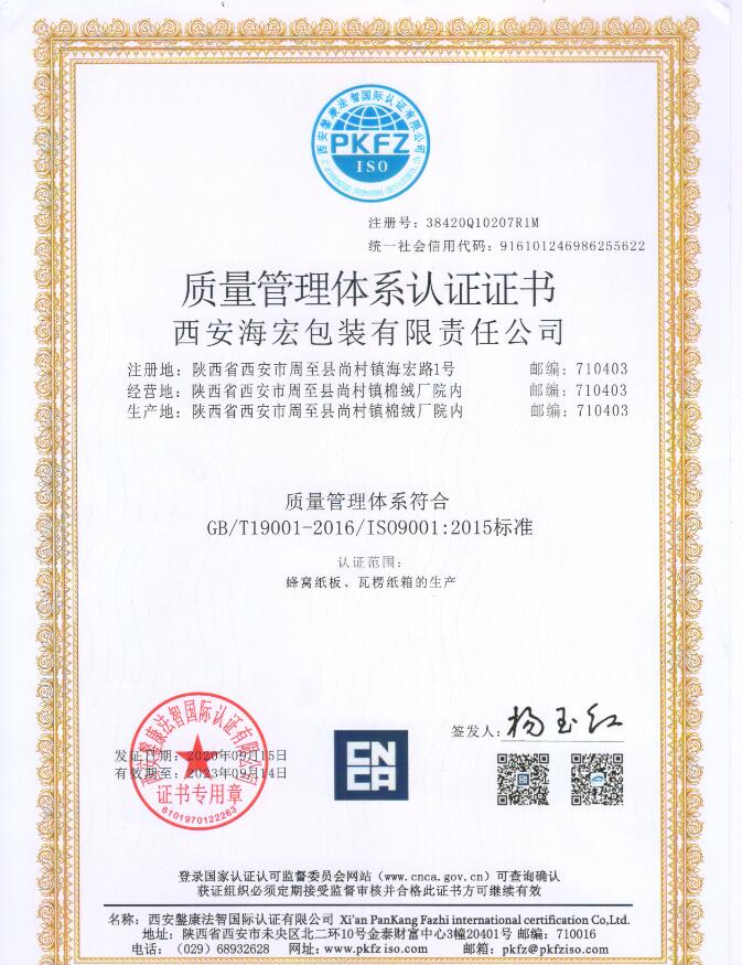 西安海宏包裝有限責任公司通過兩次“ISO9001質量管理體系認證”,建立標準管理體系。始終堅持以“質量創新,服務至上”為核心價值,品質、持續滿足企業客戶要求,用心的服務贏得了眾多企業的信賴和好評。